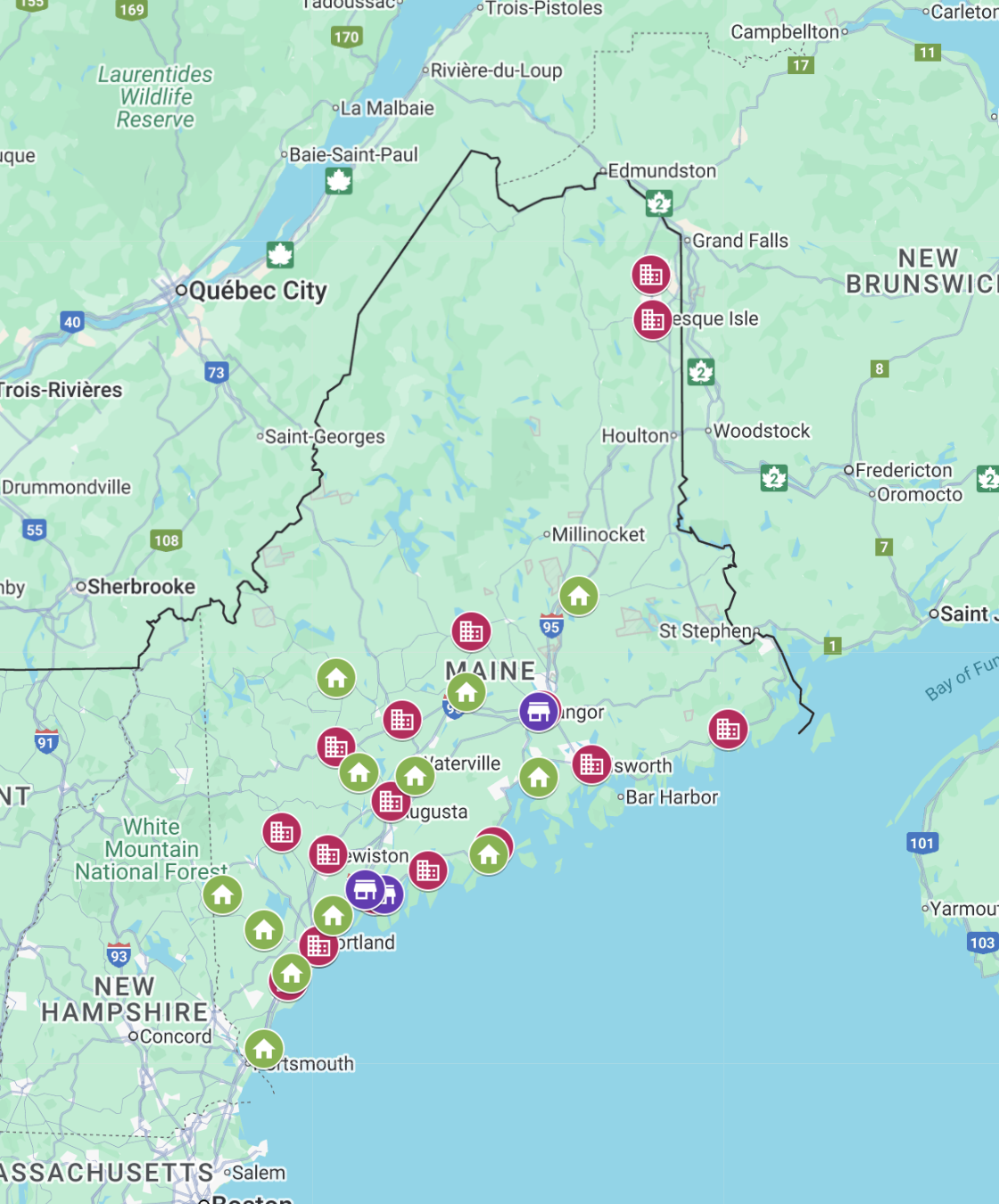 Click on the map to use view options in your area, search by region, or explore care types across Maine. Each listing includes basic details and links to learn more or contact the facilities and providers directly.